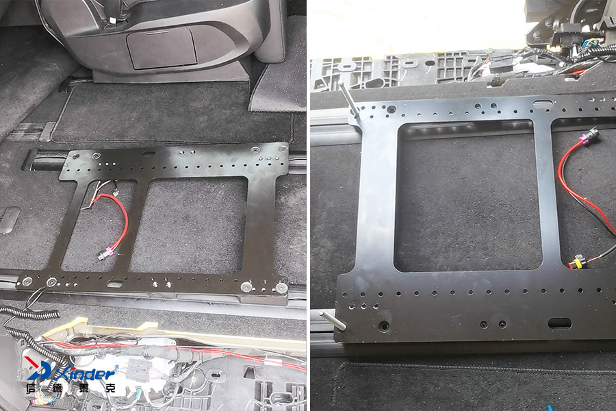 2. 安裝固定支架 拆下原車座椅軌道長滑軌并取出底部滑軌芯,塞入滑塊確定大致方位后,將通用固定支架固定在軌道上