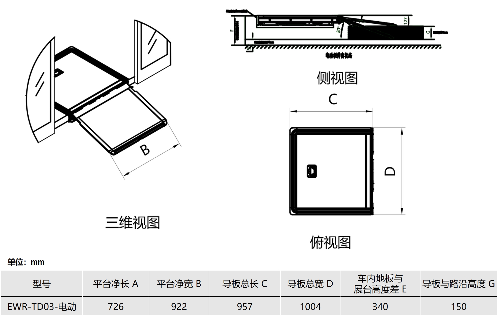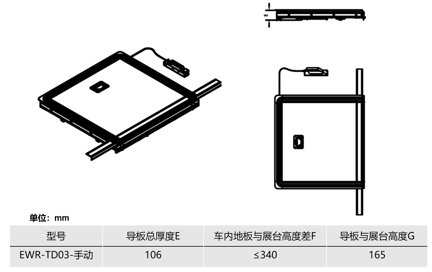 EWR-TD03手自一體導(dǎo)板是信德泰克全新產(chǎn)品,主要應(yīng)用于城市低地板公交,可方便輪椅乘客上下車。導(dǎo)板安裝在地板下方,不影響其它乘客進(jìn)出,不占用車內(nèi)空間。此款產(chǎn)品最大的亮點(diǎn)是將翻轉(zhuǎn)導(dǎo)板和伸縮導(dǎo)板結(jié)合為一體,上端為手動翻轉(zhuǎn)導(dǎo)板,和公交地板齊平;下端為手/電動伸縮導(dǎo)板,由標(biāo)準(zhǔn)按鈕開關(guān)(安裝于儀表臺)控制,客戶可根據(jù)使用場景在兩者間選擇。導(dǎo)板由鋁材、蜂窩鋁板及不銹鋼制成,重量輕、防腐性能強(qiáng);表面進(jìn)行了防滑處理,具有遇阻停止、重力感應(yīng)、手動應(yīng)急等功能,還滿足《GB-13094-2017客車結(jié)構(gòu)安全要求》標(biāo)準(zhǔn)要求。