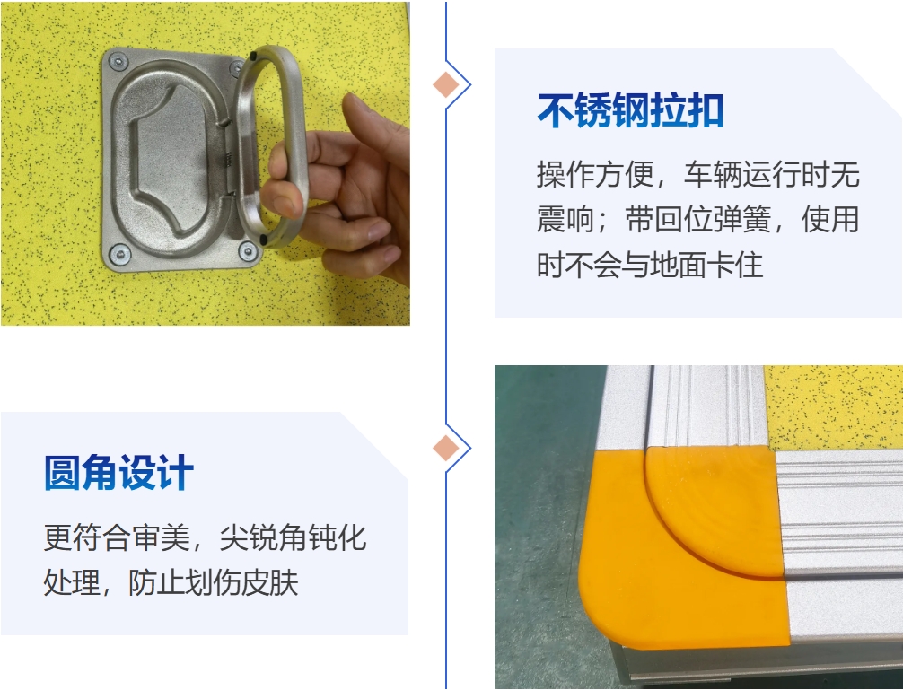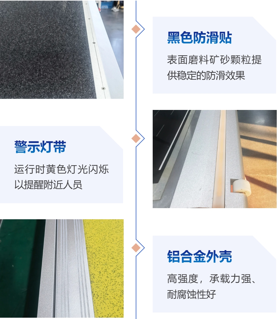 平臺防滑:伸縮導(dǎo)板和翻轉(zhuǎn)導(dǎo)板表面均采用3M黑色防滑貼,磨料礦砂顆粒提供穩(wěn)定的防滑表面;