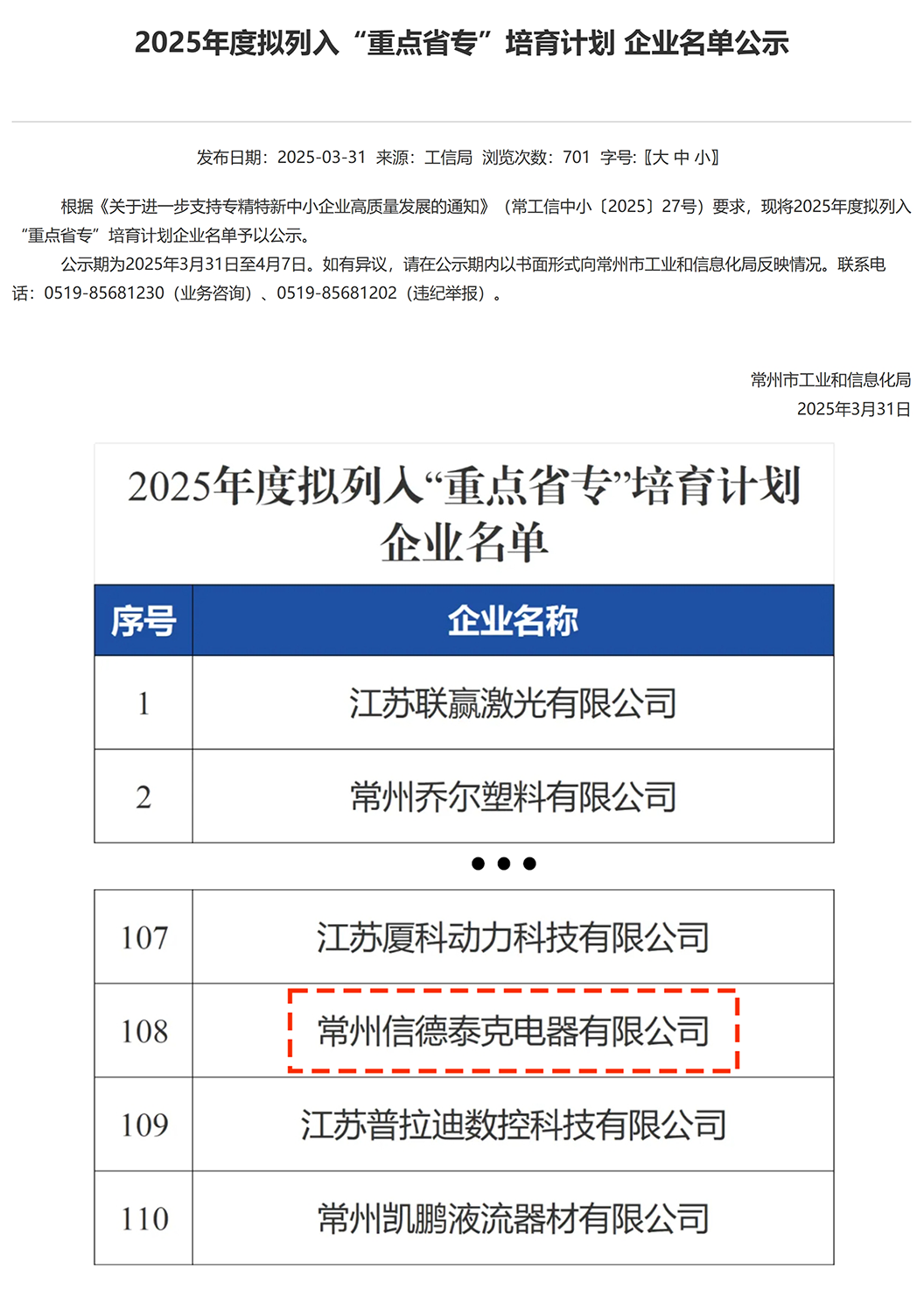 3月31日,常州市工業(yè)和信息化局公布2025年度“重點(diǎn)省專”培育計(jì)劃支持名單,全市包括常州信德泰克電器在內(nèi)共有174家企業(yè)入選,彰顯中小企業(yè)創(chuàng)新發(fā)展的活力與潛力!