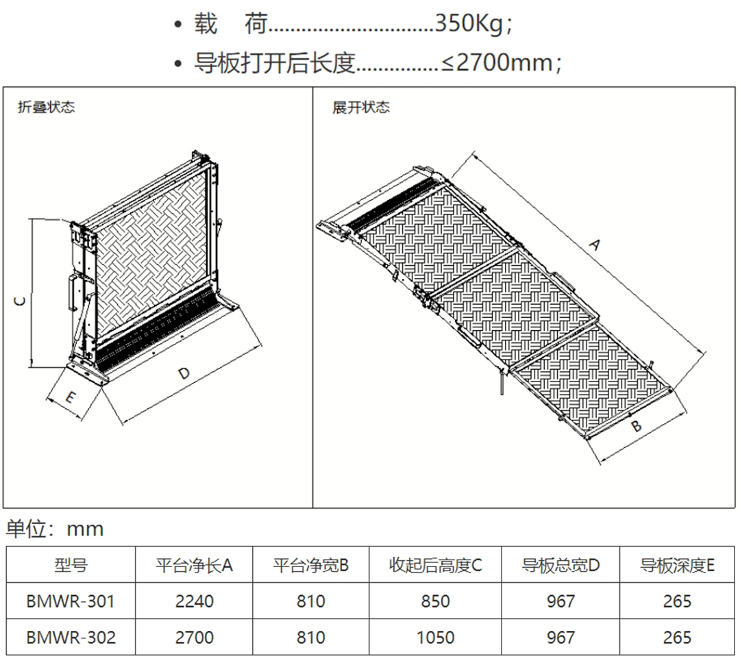 BMWR-3系列手動折疊式輪椅上車導板適用于商務車的尾門,該導板由鋁合金及帶防滑面的蜂窩鋁板制成,重量輕、防腐性能好。