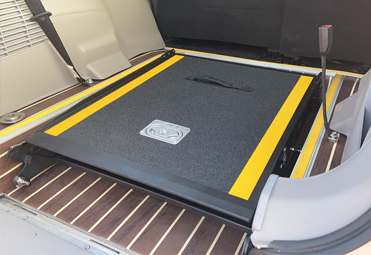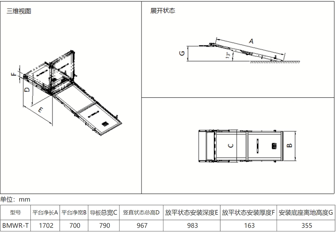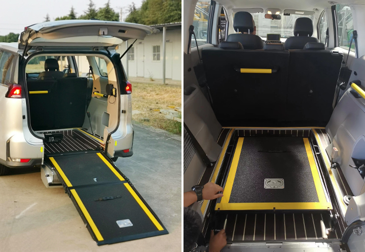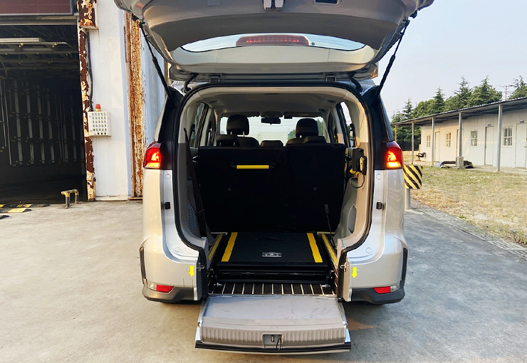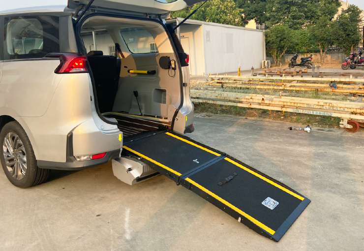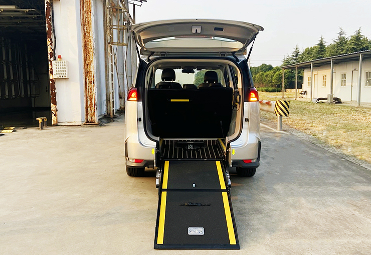 BMWR-T手動(dòng)折疊式輪椅上車導(dǎo)板安裝在車輛尾門處,打開后形成斜坡,輔助輪椅乘客上下車。