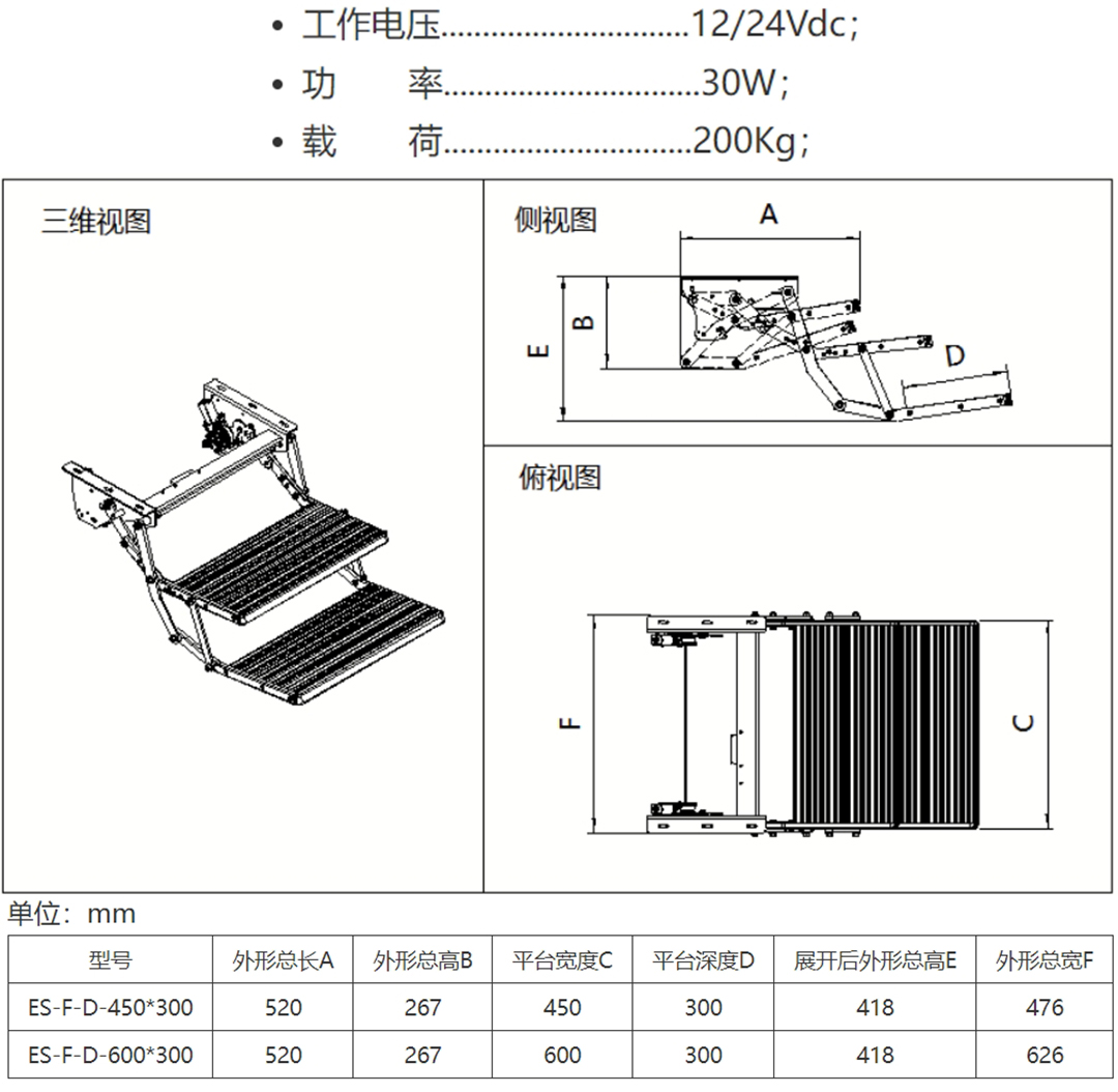 ES-F-D系列兩級(jí)電動(dòng)折疊踏步可廣泛用于商務(wù)車、房車及救護(hù)車,可裝在側(cè)門踏步下,主要功能是降低上車高度,方便乘客上下車。