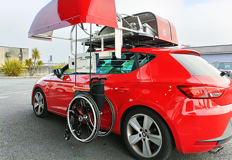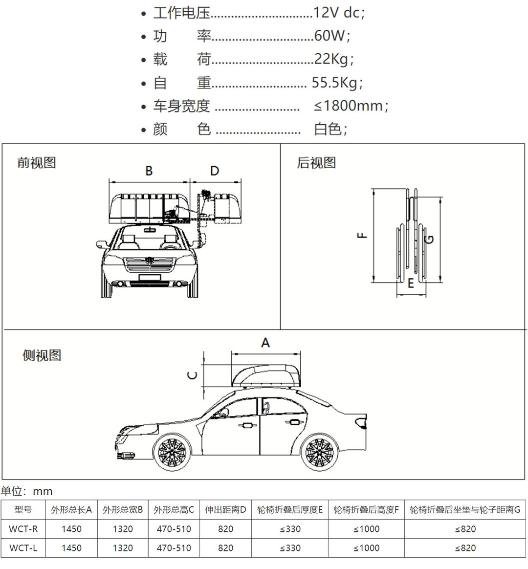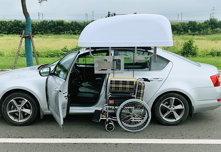 車頂輪椅收納裝置安裝于轎車或SUV頂部,通過(guò)電驅(qū)動(dòng),可將折疊式輪椅收存于車頂罩內(nèi),便于殘疾人自駕車出行。