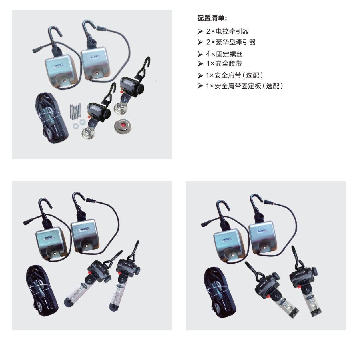 X-806x系列電控輪椅固定裝置前端2點(diǎn)采用電控牽引器,后端2點(diǎn)可搭配X800系列牽引器一起使用。
